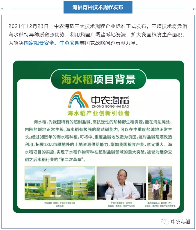 2022年1月28日,深圳市福田區(qū)2021年科技創(chuàng)新大事件年度盤點新鮮出爐,中農(nóng)海稻(深圳)生物科技有限公司的“海水稻(耐鹽堿稻)三大技術(shù)規(guī)程企業(yè)標(biāo)準(zhǔn)發(fā)布”榮列其中。